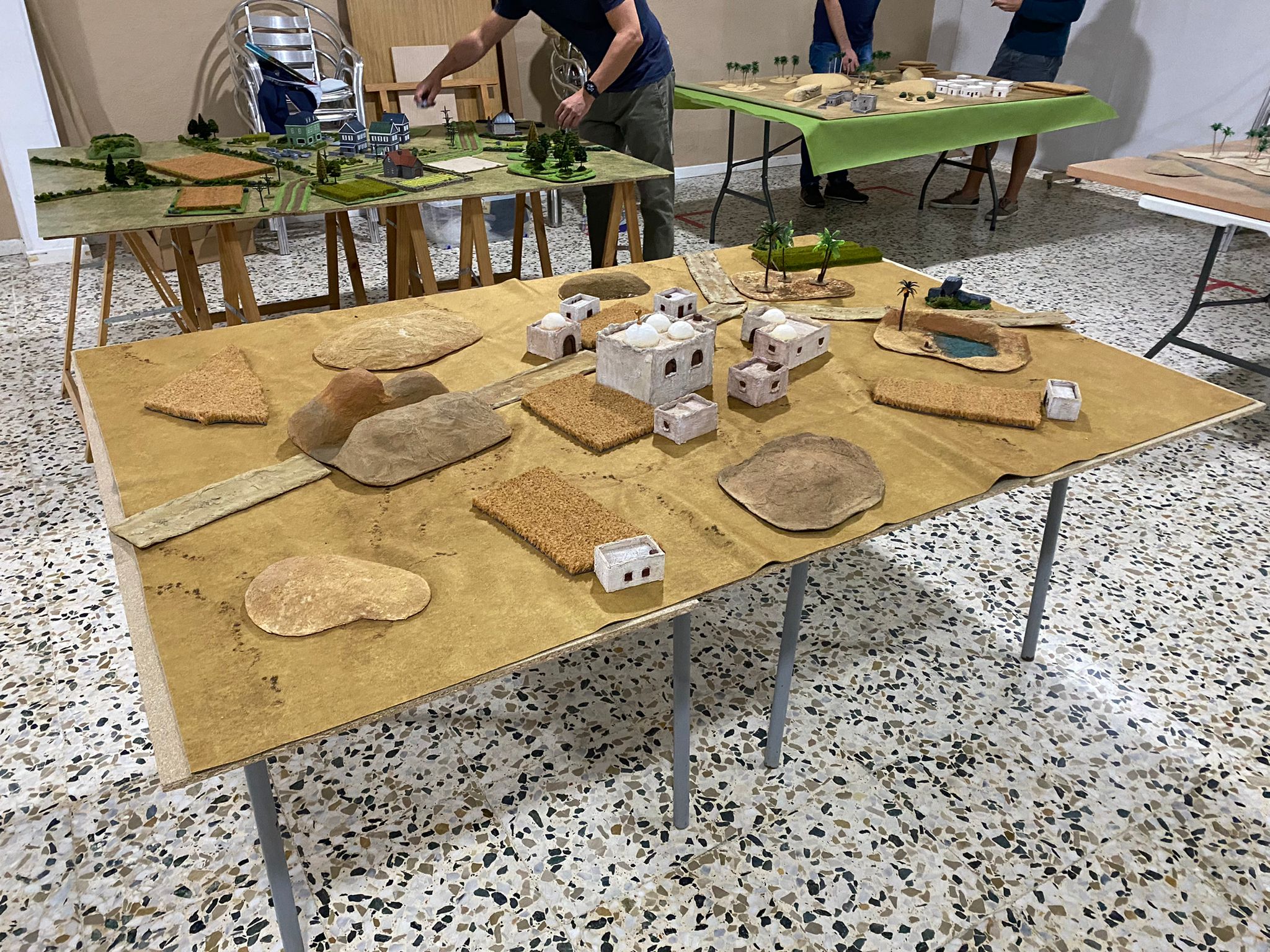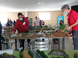 Dotar de escenografía a 16 mesas no es tarea fácil, y más para un grupo reducido de aficionados. Pero entre la escenografía que teníamos ( yo tenía para 4 mesas), más la que se hizo en los últimos meses, conseguimos que todas las mesas tuvieran un papel decente. Gente como Antonio " Talibán", José Hidalgo, Alberto García ( qué mesa más bonita¡¡), Obi ( que pintó el tablero modular de GW 20 años después jajaja), o Alberto Tigre, estuvieron haciendo elementos en las últimas semanas. A destacar el trabajo de José Luis, Dani y Víctor, que a pesar de que no jugaron, se comprometieron a ceder 3 mesas completas; y de enorme calidad, por cierto ( Dani sí jugó el torneo). Sebas, que no jugó, nos cedió también sus elementos. Jesús el mulo, cargando tablones, etc etc. En definitiva, todos aportamos en la medida de nuestras posibilidades.
